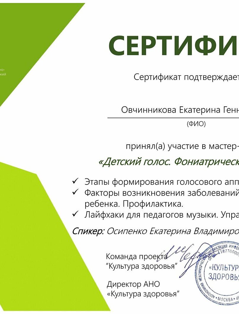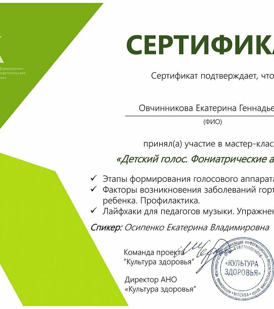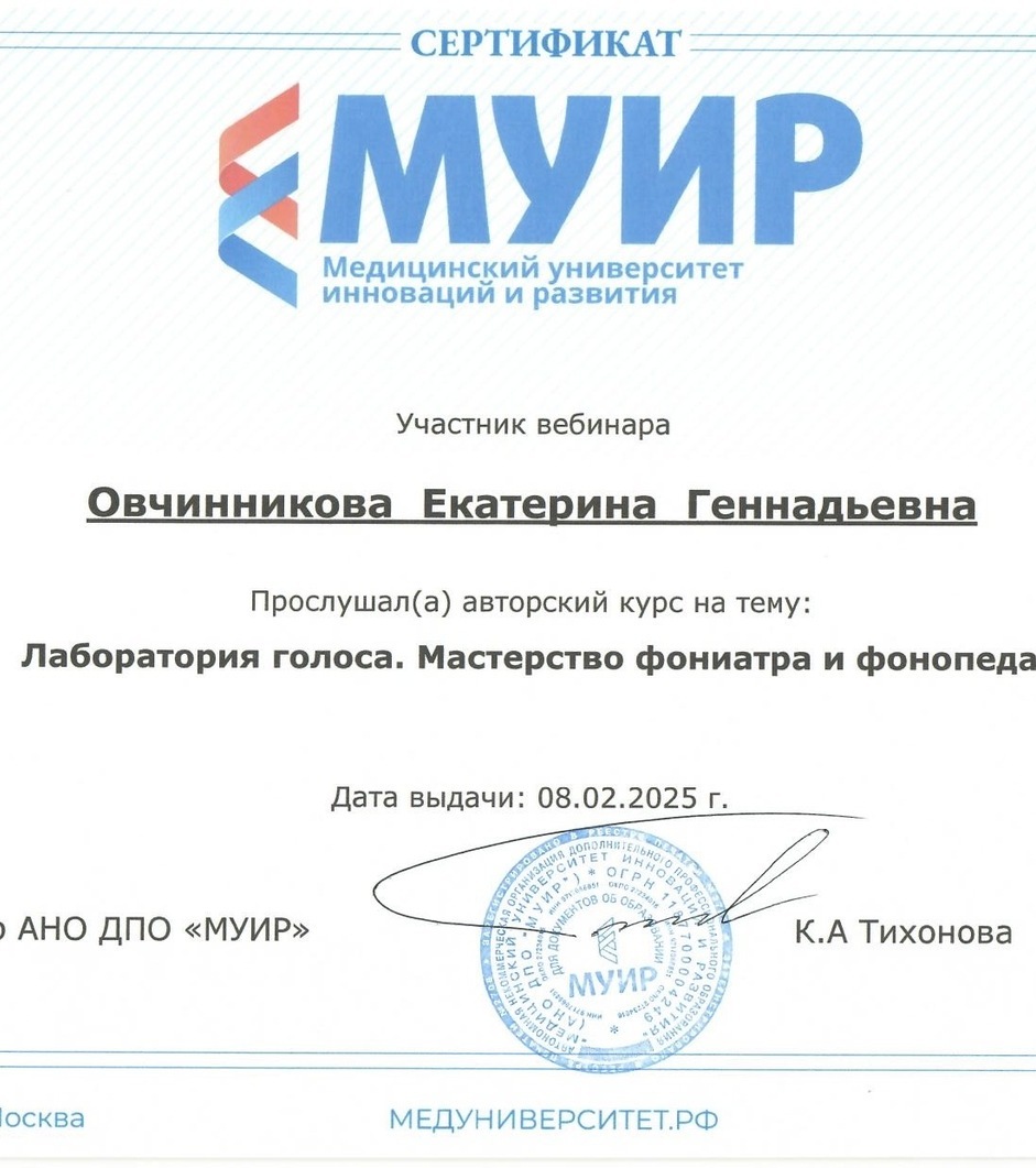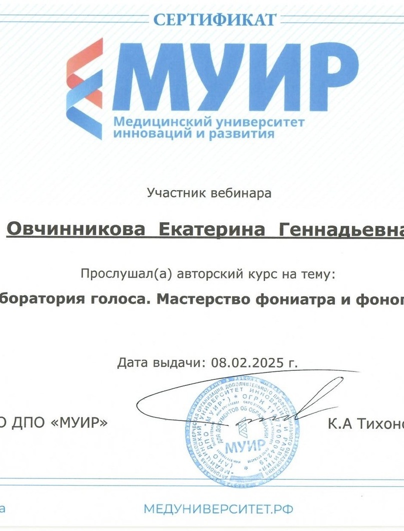 Перед первичной консультацией фонопеда необходимо сходить на консультацию к врачу-фониатру и выполнить назначенное им и врачами смежных специальностей лечение. Заключение врача-фониатра высылайте сразу при записи на первичную встречу.